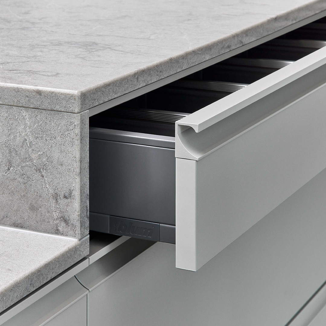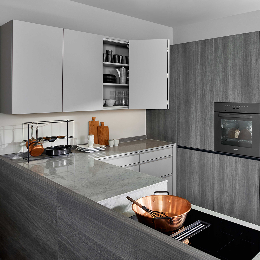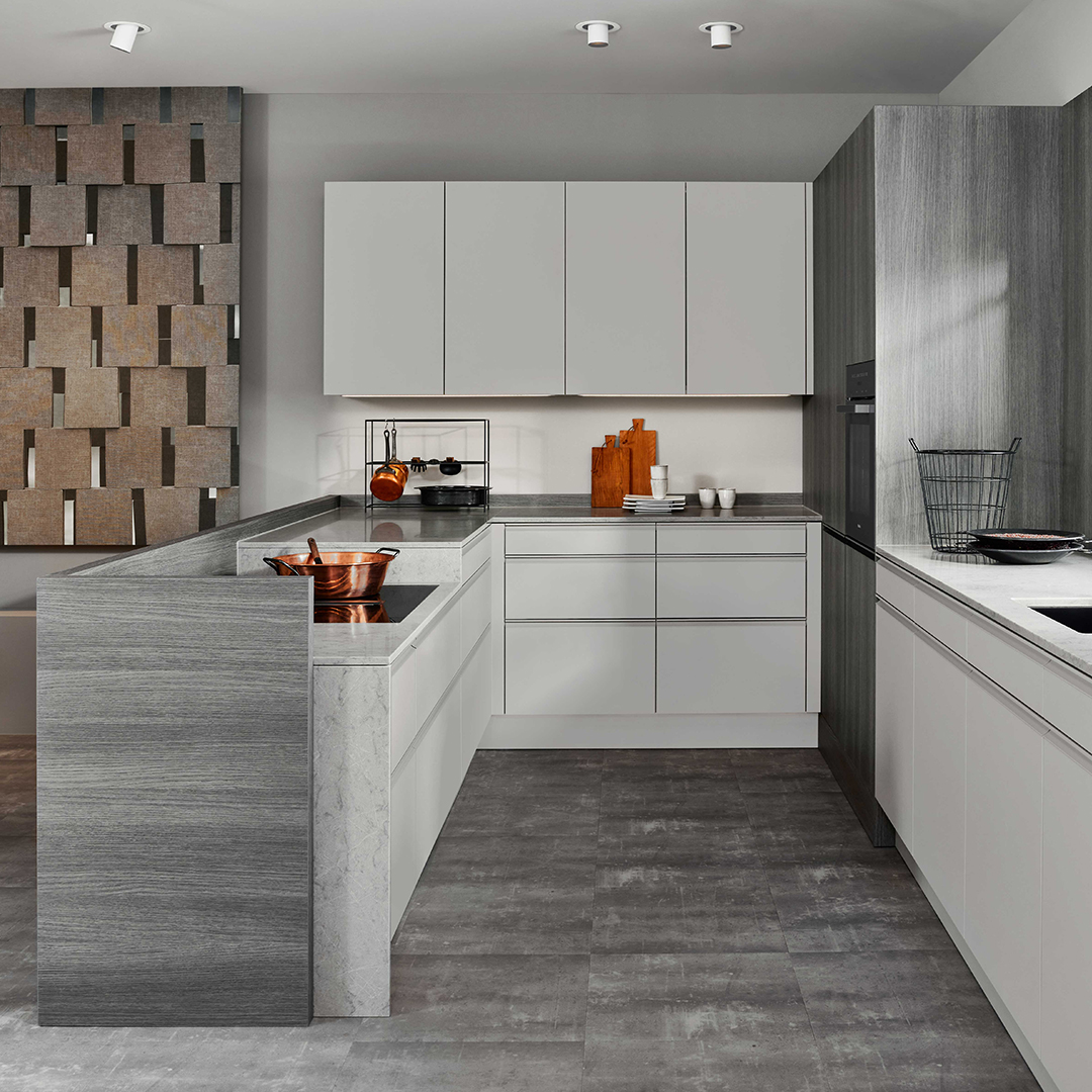 Die neue Frontfarbe Kieselgrau wird in dieser Küche mit dem Holzton Cleaf Sentina vertikal kombiniert. In Szene gesetzt durch die aufgesetzte Griffleiste, in den Ausführungen Pulverbeschichtung Kieselgrau und Metallschwarz. Die Pulverbeschichteten Griffleisten sind besonders resistent gegen Kratzer und Abnutzung.