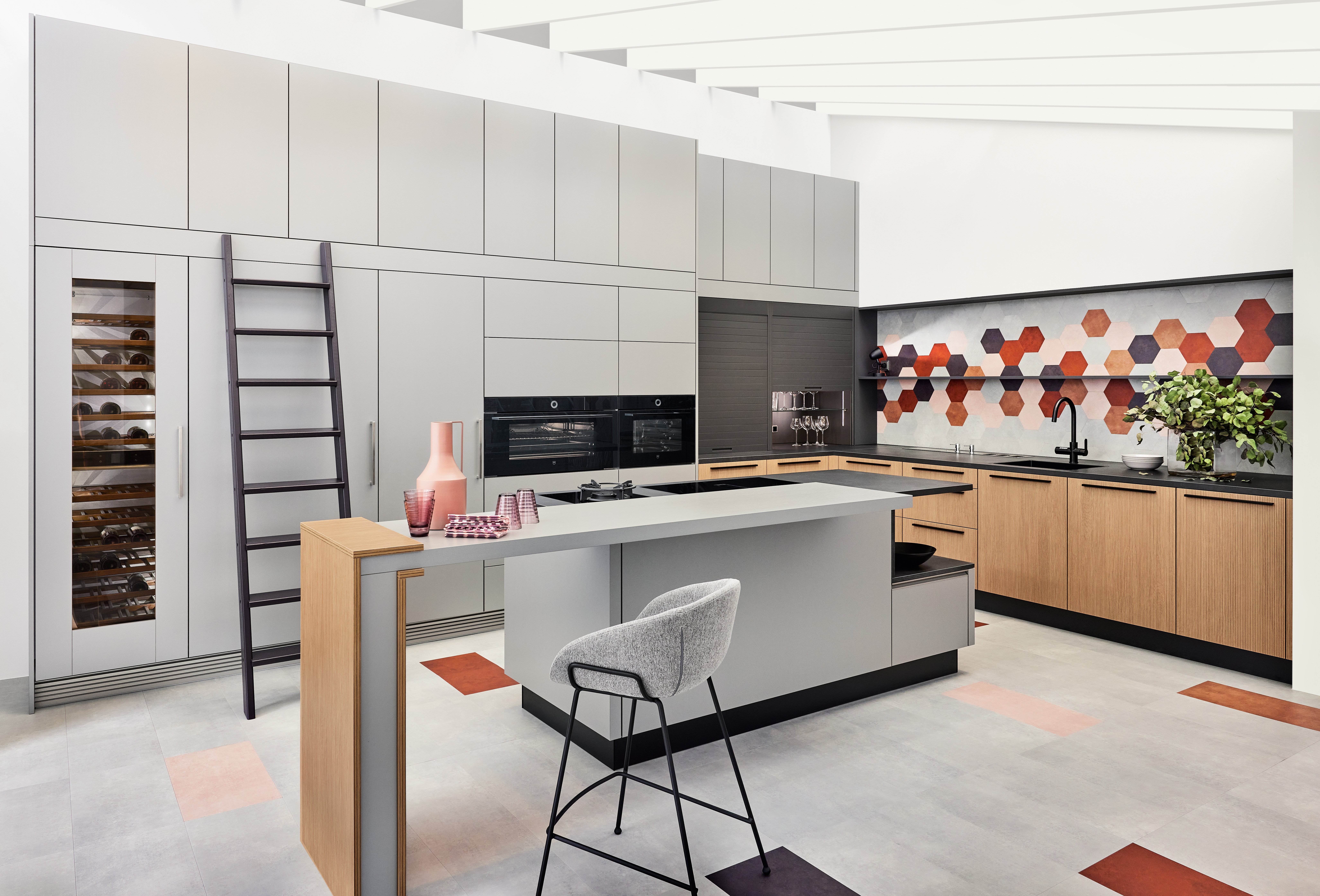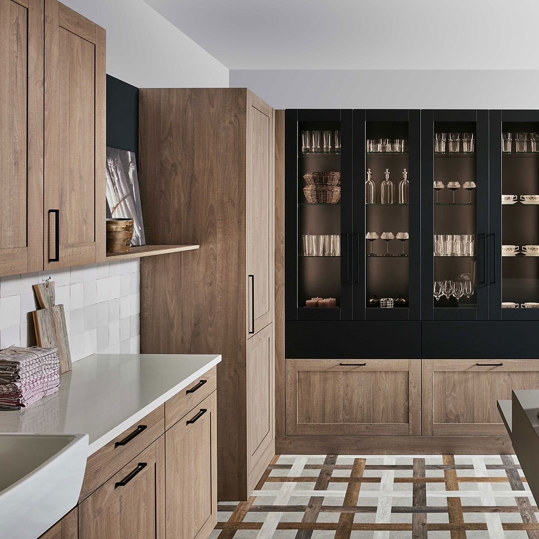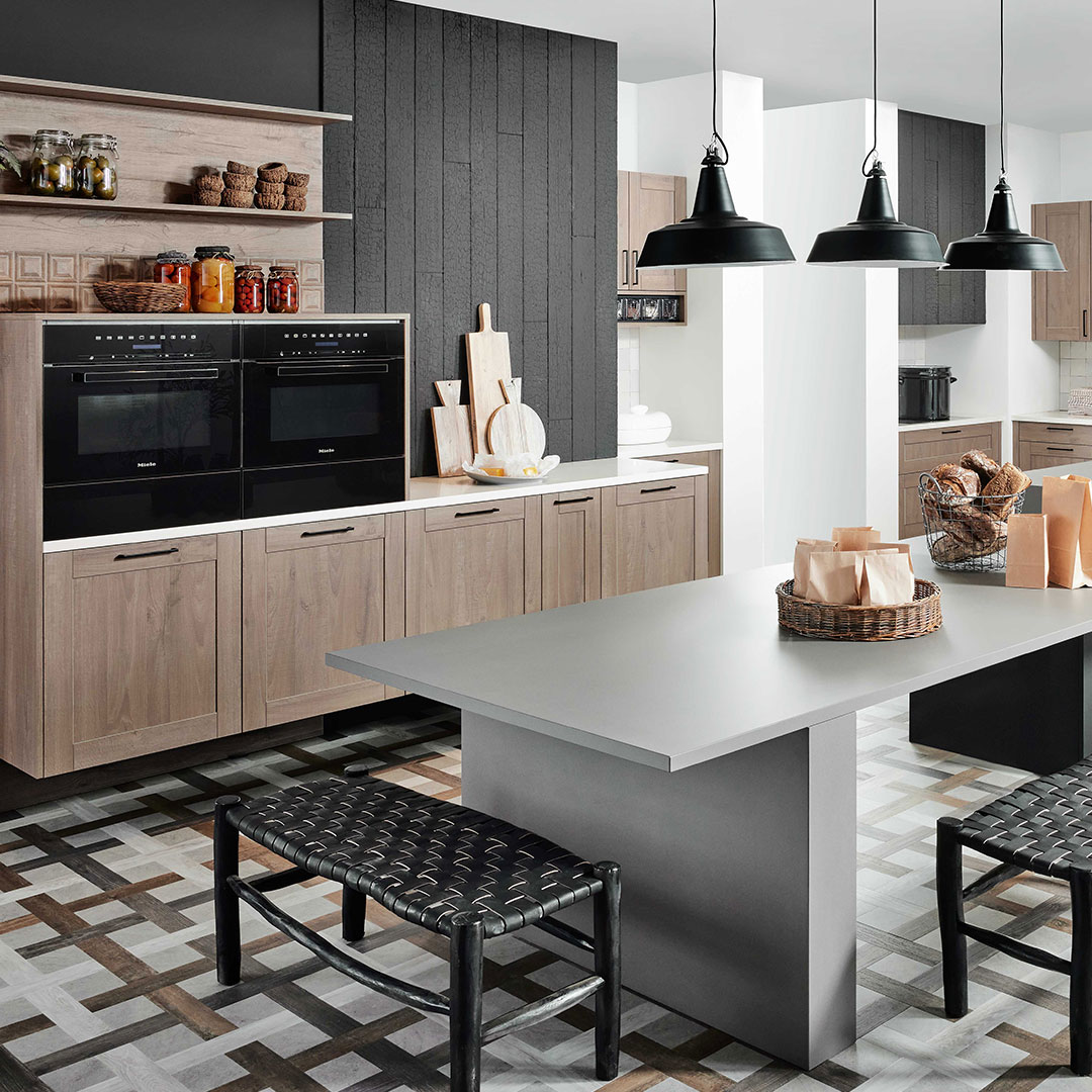 Die neue Frontfarbe Kieselgrau wird in dieser Küche mit dem Holzton Cleaf Sentina vertikal kombiniert. In Szene gesetzt durch die aufgesetzte Griffleiste, in den Ausführungen Pulverbeschichtung Kieselgrau und Metallschwarz. Die Pulverbeschichteten Griffleisten sind besonders resistent gegen Kratzer und Abnutzung.