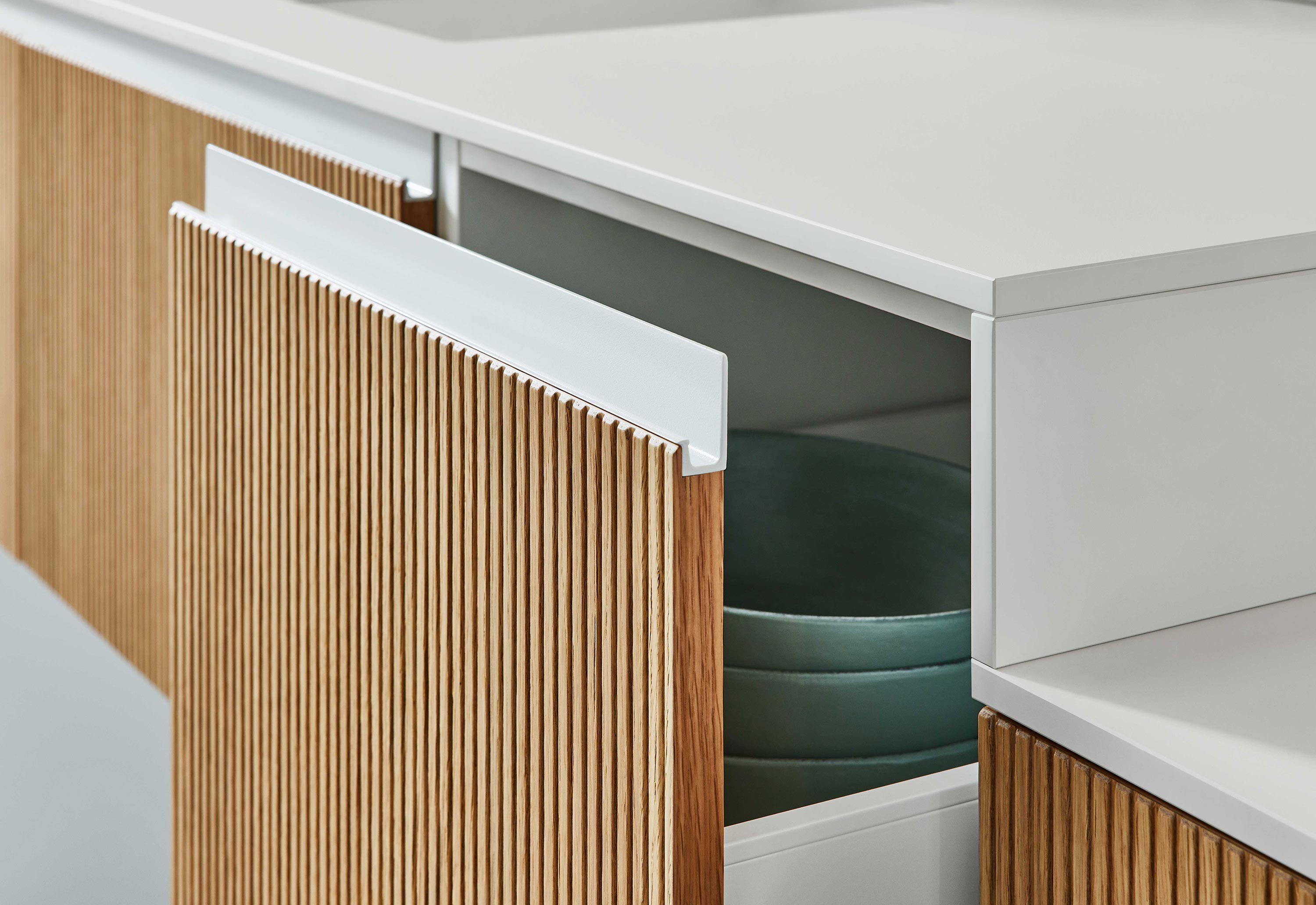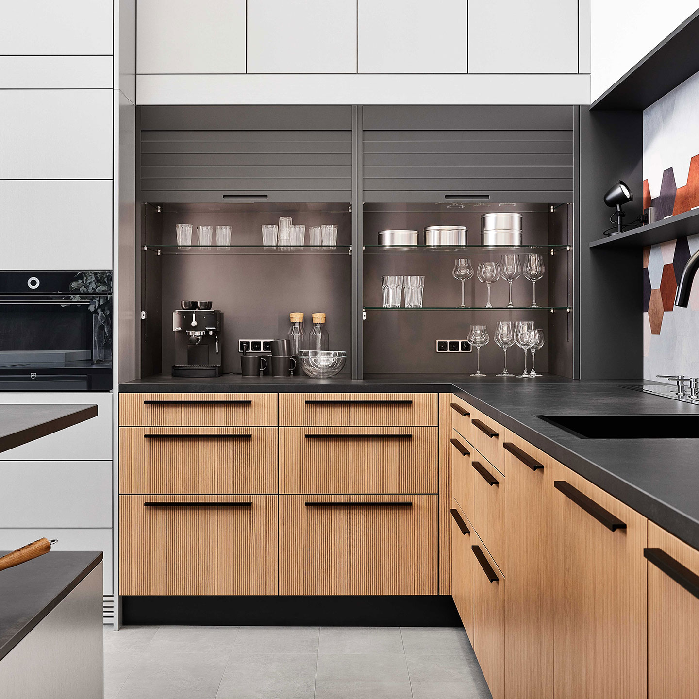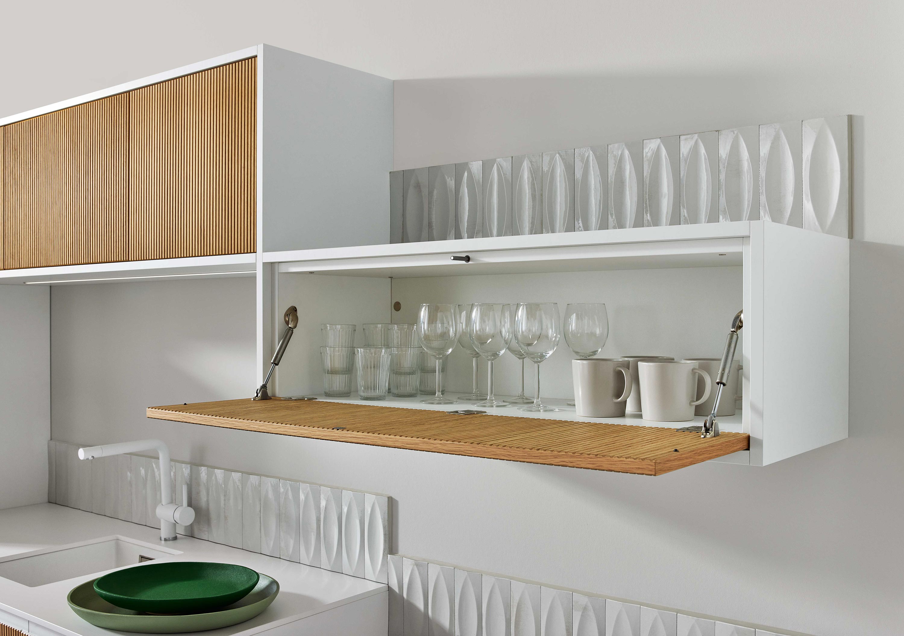 Verbergen Sie Gläser und Geschirr hinter den schicken Lamellen, um eine aufgeräumte Ästhetik zu schaffen, ohne auf den einfachen Zugriff zu verzichten.