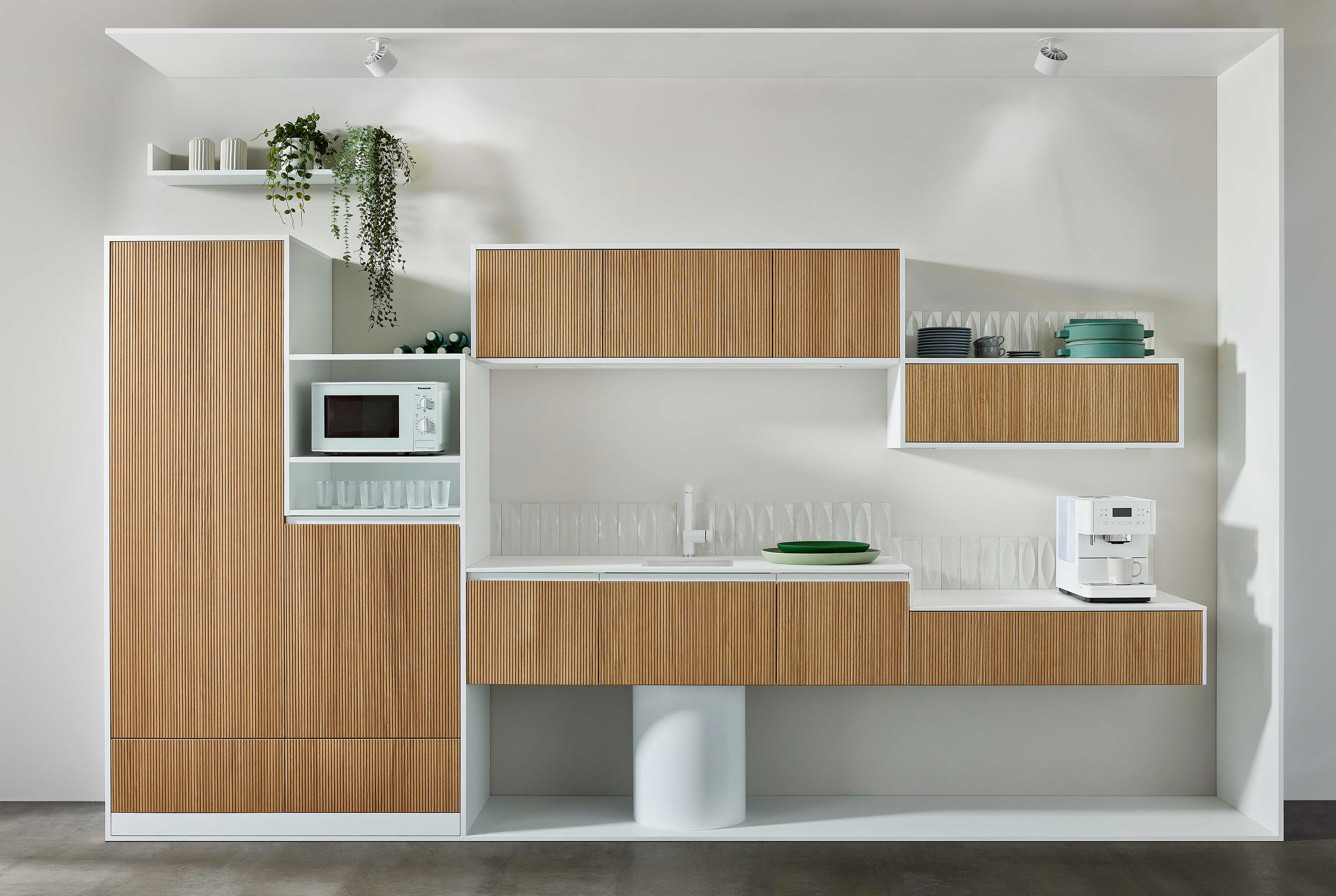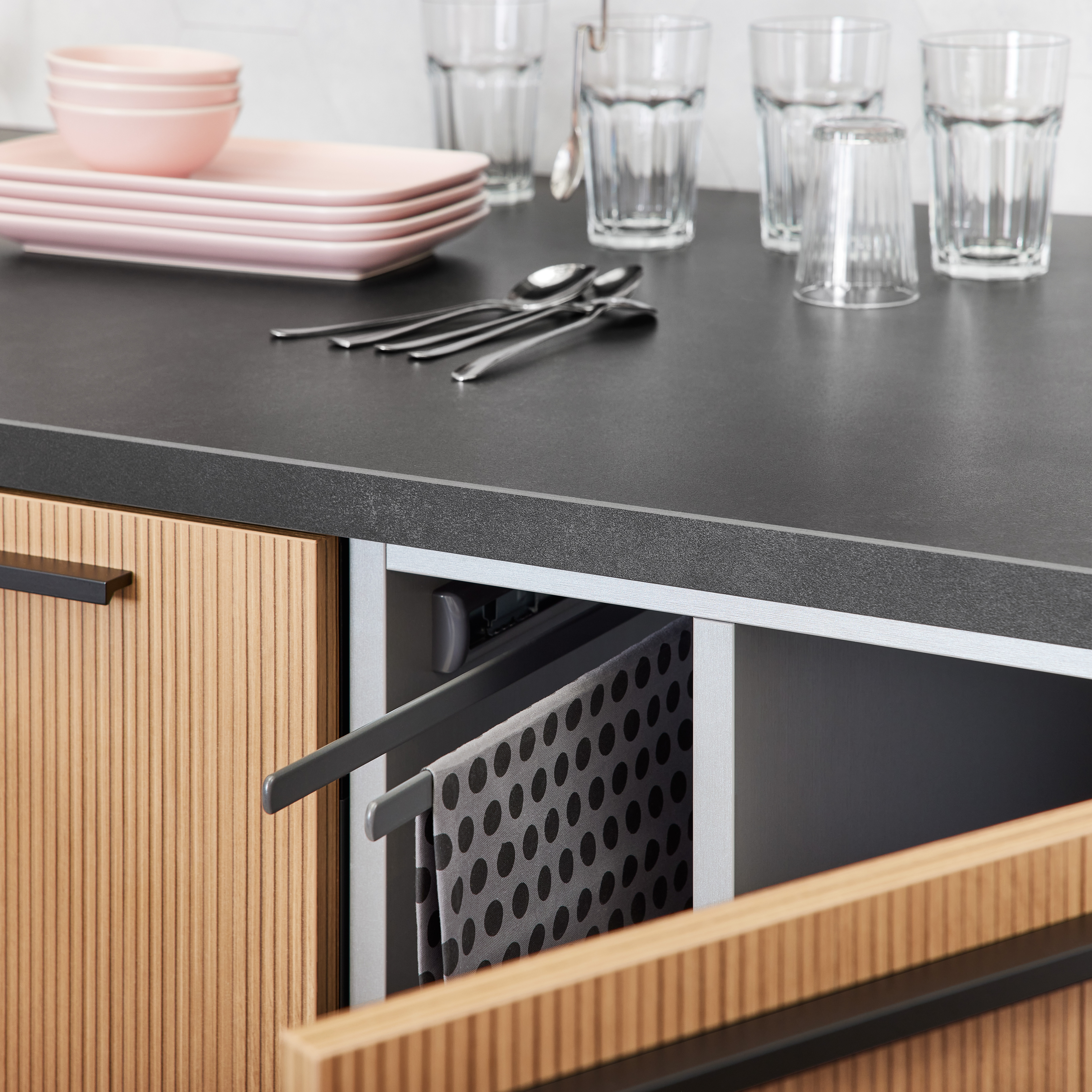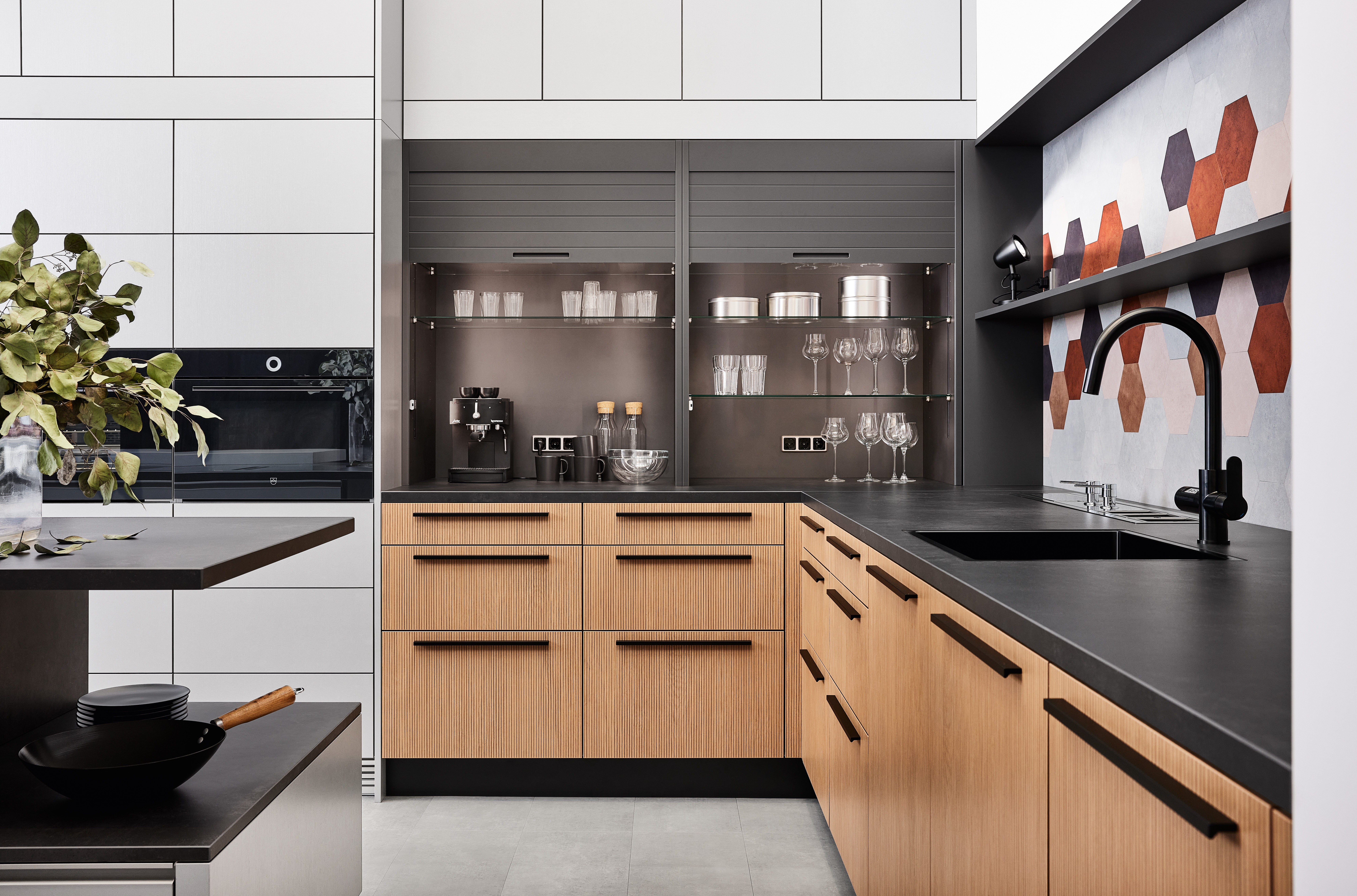 Verbergen Sie Gläser und Geschirr hinter den schicken Lamellen, um eine aufgeräumte Ästhetik zu schaffen, ohne auf den einfachen Zugriff zu verzichten.