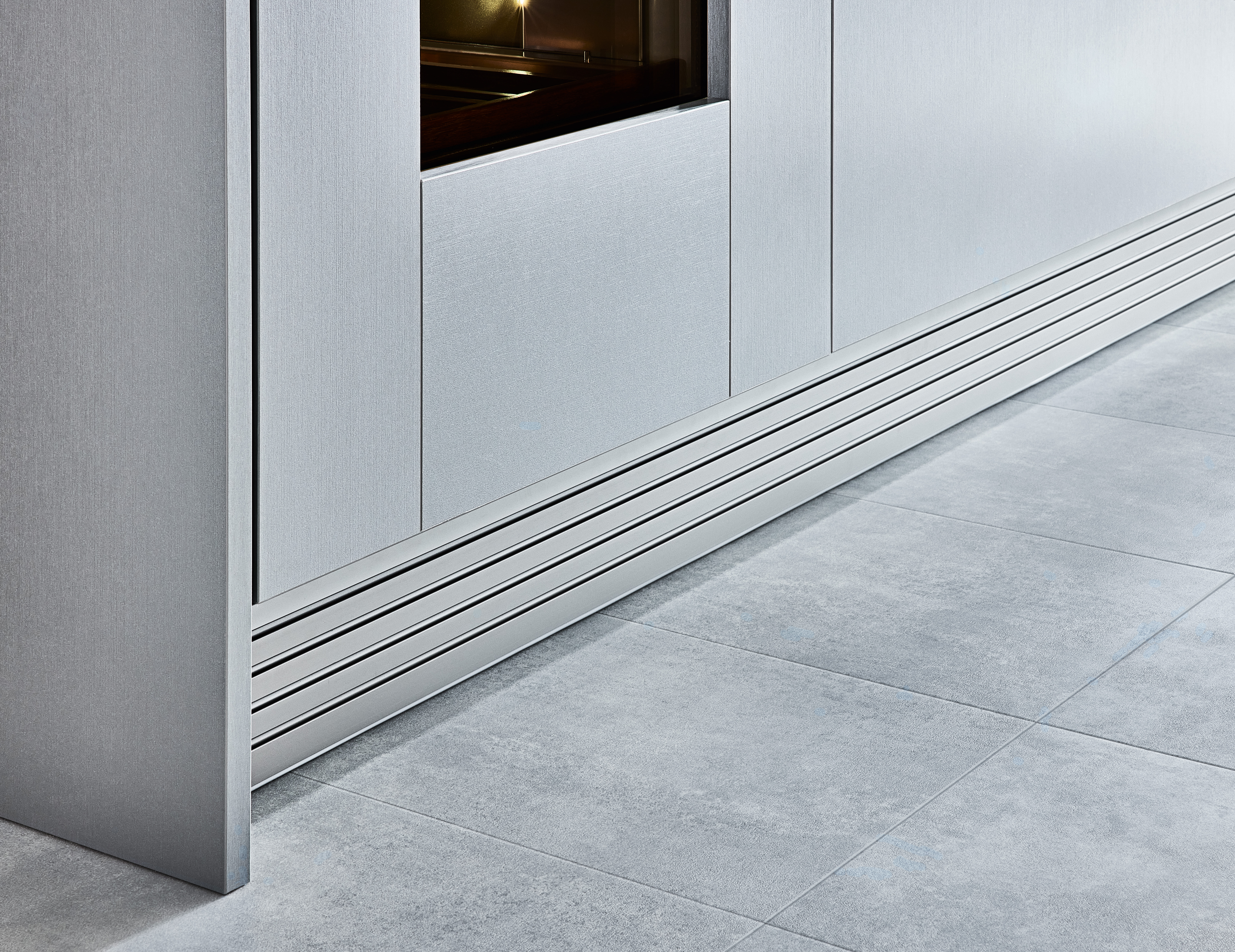 Besonders viel Stauraum bieten die Seitenschränke in Raumhöhe. Integriert ist hier u.a. ein Weinkühlschrank, der durch die Optik des aufgesetzten Rahmens aus Frontmaterial harmonisch integriert wird. Die Belüftung der verbauten Kühlgeräte wird durch den Aluminium-Lamellensockel sichergestellt, dieser fügt sich perfekt in die Optik der Küche.