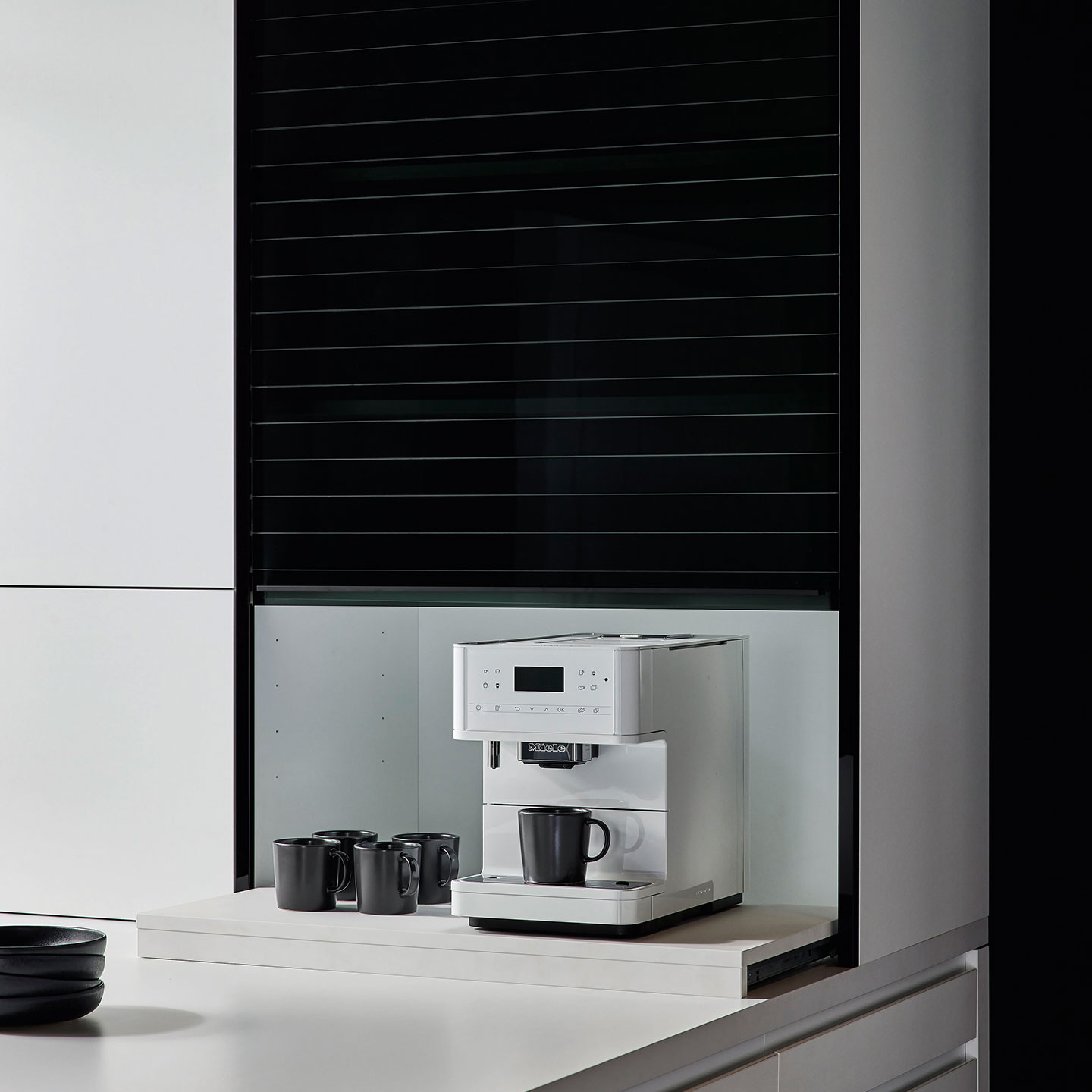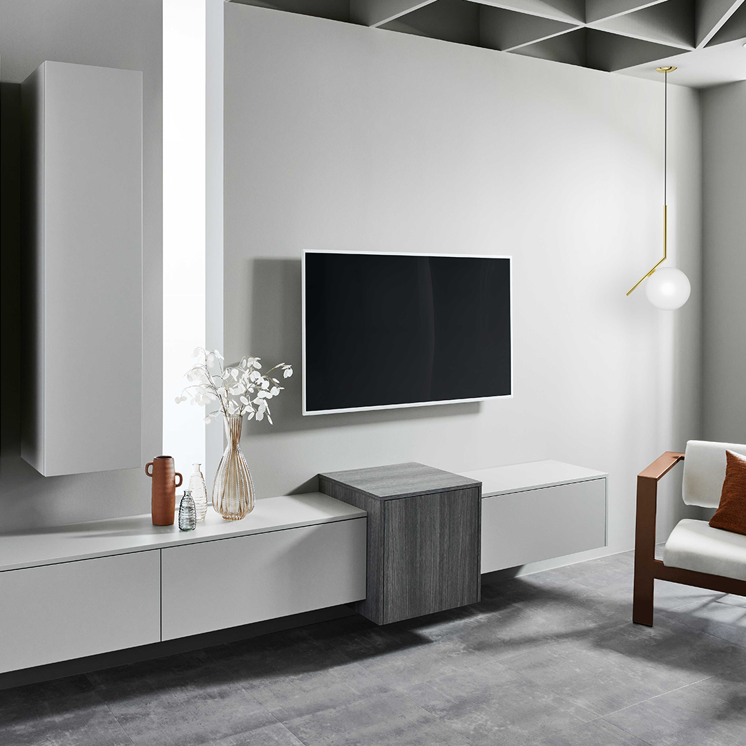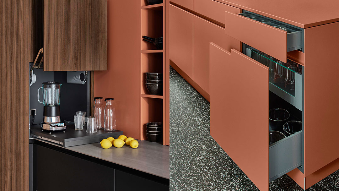 Technisch sind hier der Arbeitsplatten-Aufsatzschrank mit Falttür sowie die Lifttür mit Nischentablar zu erwähnen. Diese sind mit Hilfe der Öffnungsunterstützung Tip-On und ServoDrive einfach zu Öffnen und machen den Innenraum frei zugänglich. Hier haben Sie alles schnell im Blick.