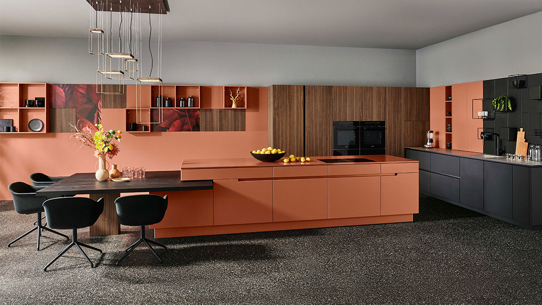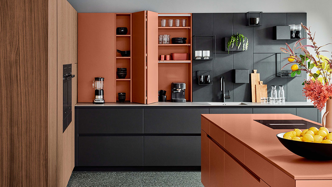 Die Seitenschränke in Echtholz Nussbaum Lugano mit Rille setzen sich optisch und haptisch von den unifarbenen matten Oberflächen der Unterschränke in Metallschwarz und Sonderfarbe Sikkens Orange ab. Die Küche bekommt dadurch ein wohnliches Flair und besonderen Charme.